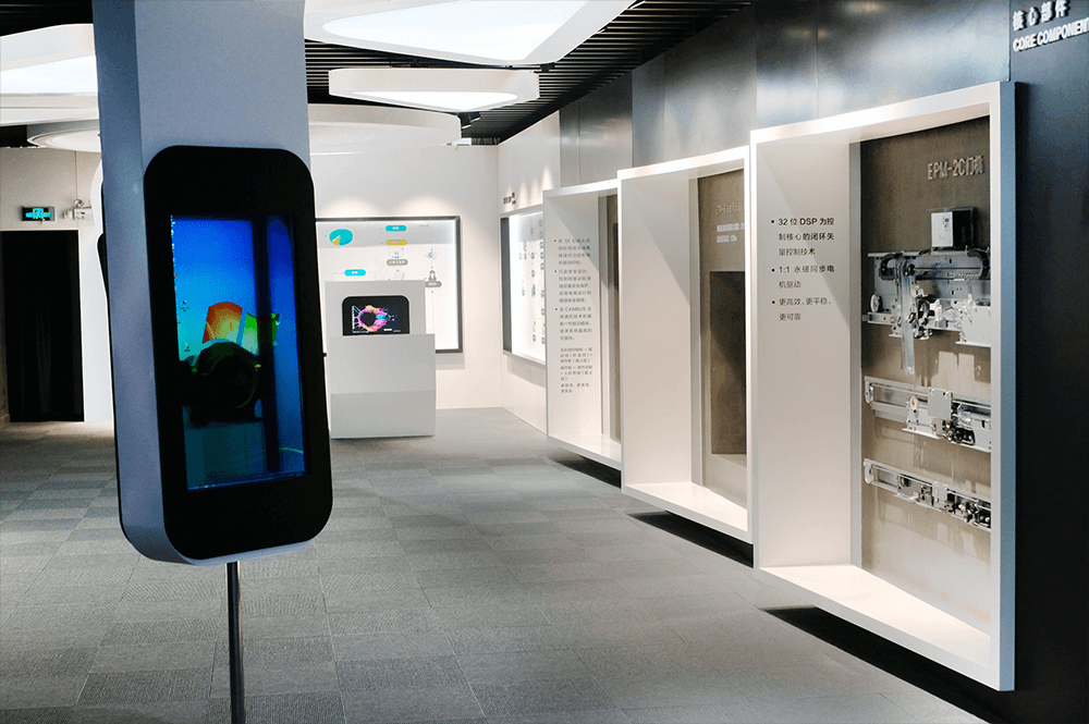 展廳占地600平方米,位于英沃總部辦公大樓1層,主要分為六大區域:文化長廊展示區、工程業績展示區、核心部件與安全配件展示區、多媒體與互聯網+、物聯網展示區、人機界面展示區、轎廂裝潢展示區。轎廂裝潢展示區有住宅、商務、酒店等不同應用場景的實景效果,提升了英沃電梯的產品體驗。在設計與功能上展廳創意新穎,布局合理,向到訪的客人展示英沃電梯品牌內涵和文化理念:安全為本、智慧領先、綠色環保,以人為尚。