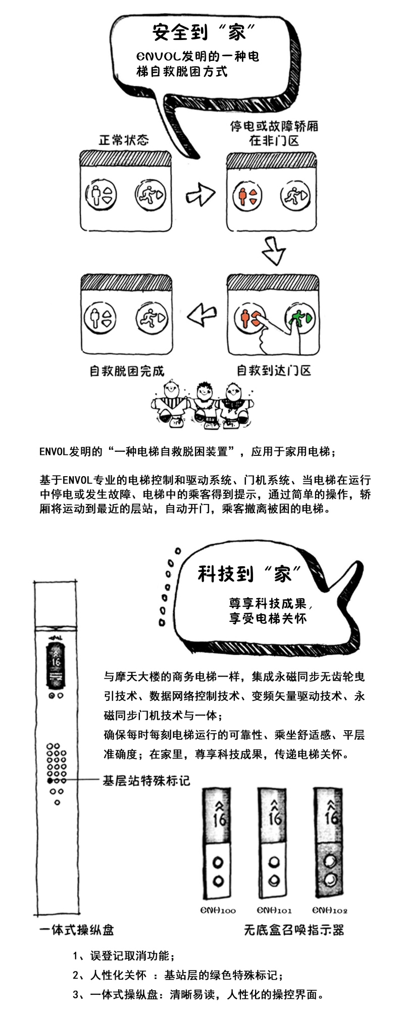 其中值得一提的是,英沃家用電梯(ENH100)專為高檔別墅住宅所設(shè)計,成功應(yīng)用了“電梯自救脫困”的全新技術(shù),實現(xiàn)“一困就脫”的創(chuàng)新突破。基于英沃專業(yè)的電梯控制和驅(qū)動系統(tǒng)、門機系統(tǒng),當(dāng)電梯在運行中停電或發(fā)生故障,電梯中的乘客將得到提示,通過簡單的操作,轎廂將運動到最近的層站,自動開門,乘客撤離被困的電梯。英沃家用電梯的這種新科技完美詮釋了“安全到家”的電梯理念。